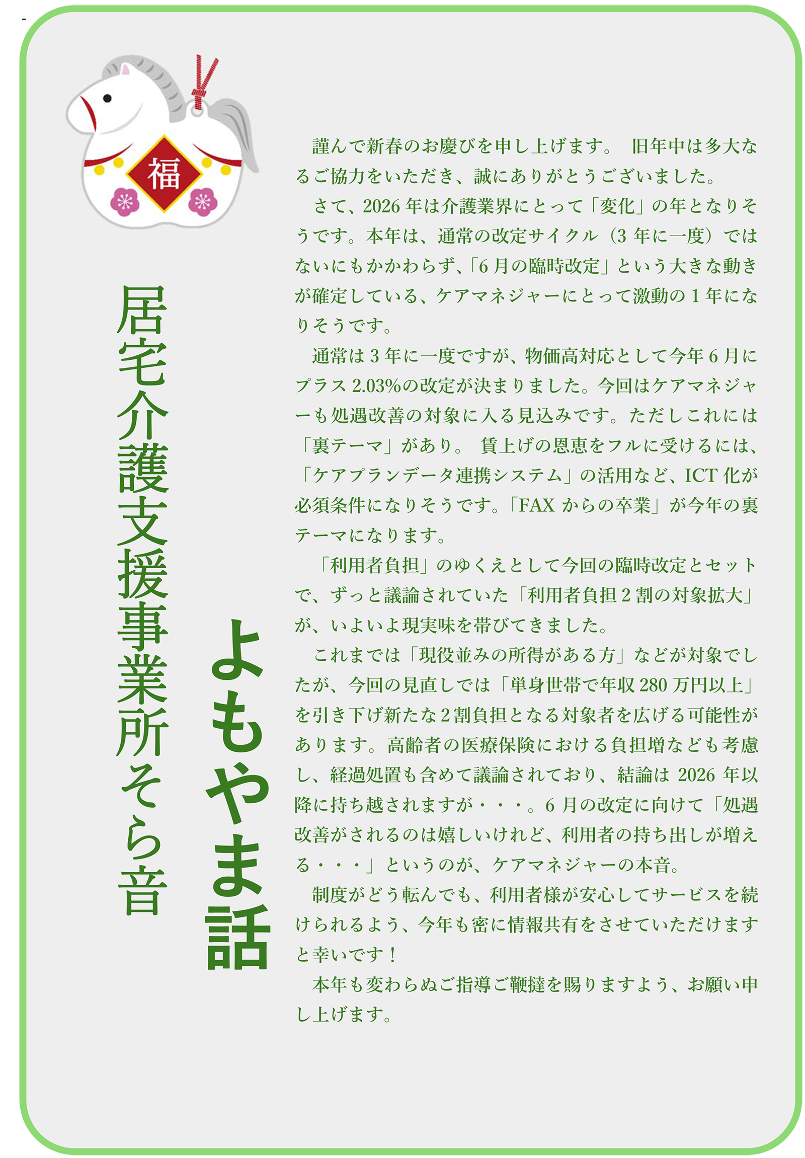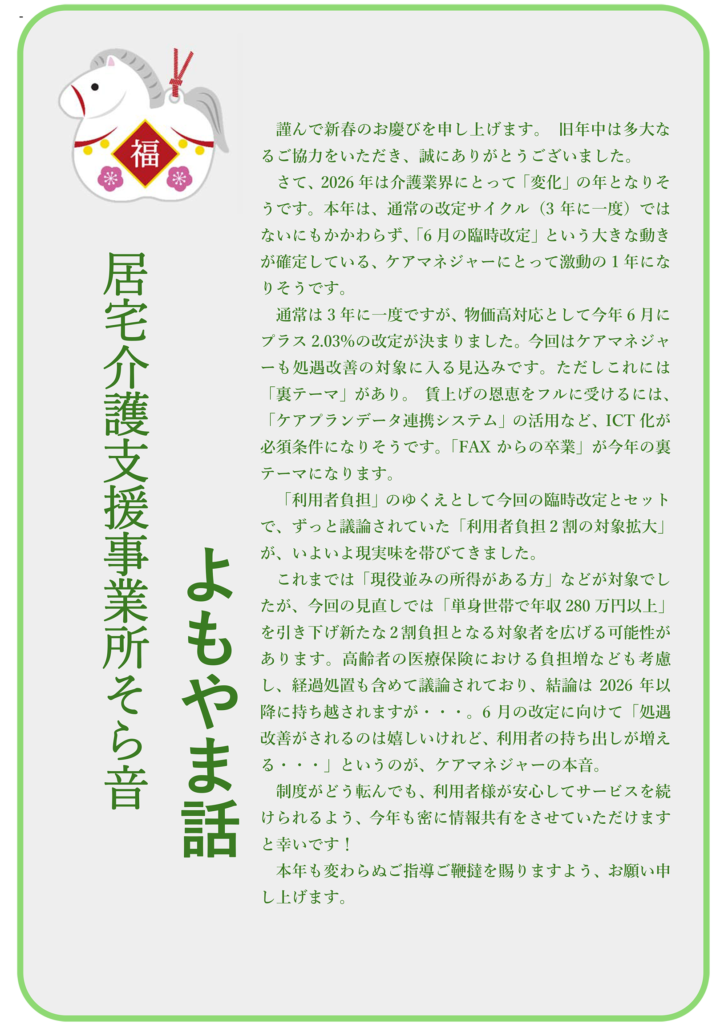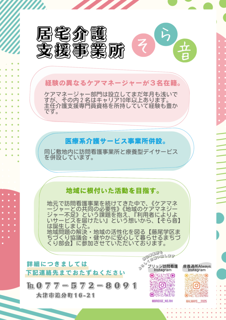 2014年8月、【ブリッジ訪問看護ステーション】の開設から7年後。2021年6月に産声を上げた【居宅介護支援事業所そら音】は、代表・橋口倫宏が訪問看護事業を続けてきた中、《ケアマネージャーとの共同の必要性》《地域のケアマネジージャー不足》という課題を抱え、『利用者によりよいサービスを届けたい』という想いから、誕生しました。バックボーンの異なる3人のケアマネージャーが日々奮闘中です。
